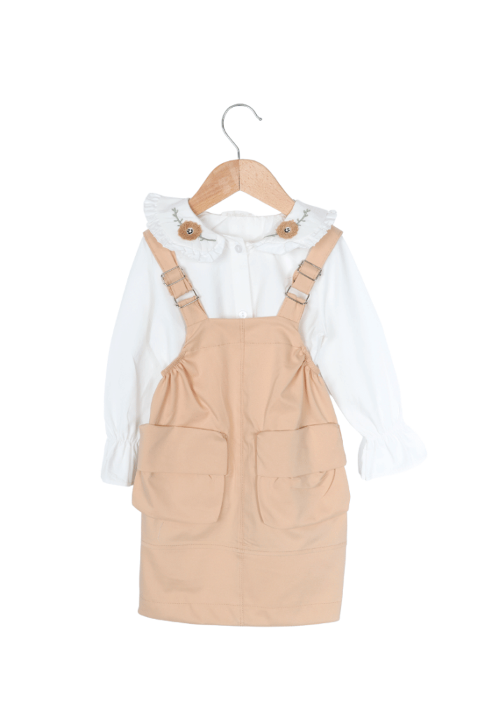 - Askı detayı ve ahşap düğmeleriyle retro bir tarz sunarken, esnek bel kısmı sayesinde çocukların hareket özgürlüğünü kısıtlamaz.
