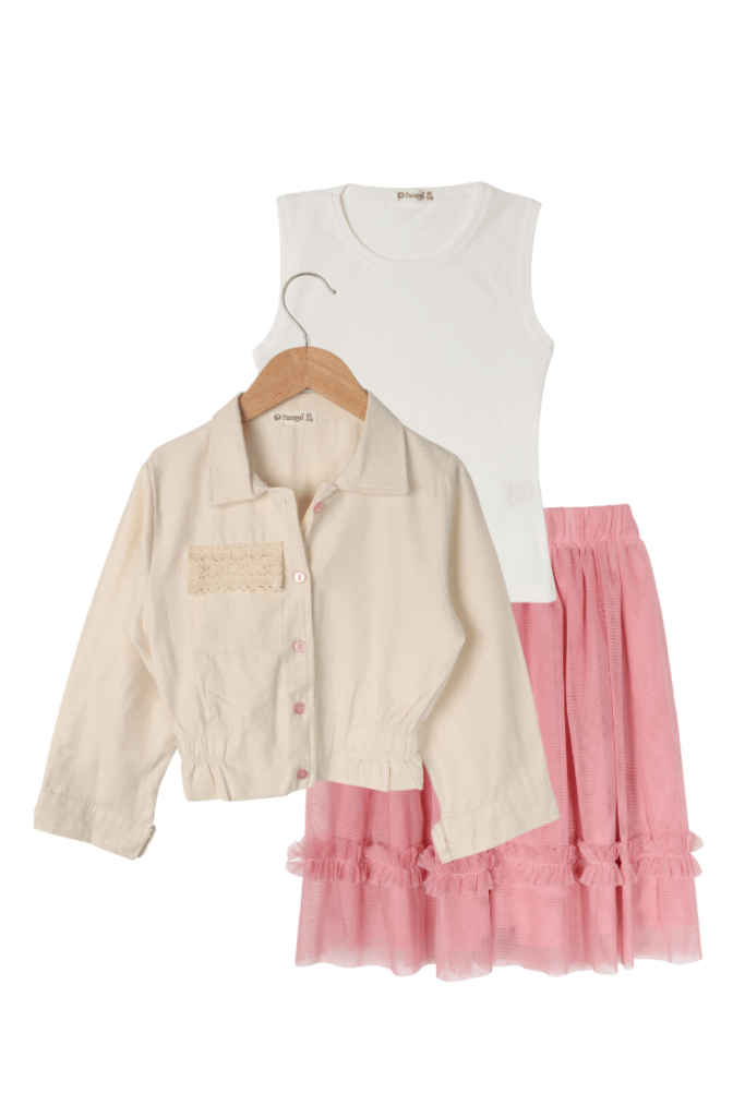 Kız Çocuk Lastikli Cetekli ve Türlü Etekli 3’lü Takım Bej-Pembe