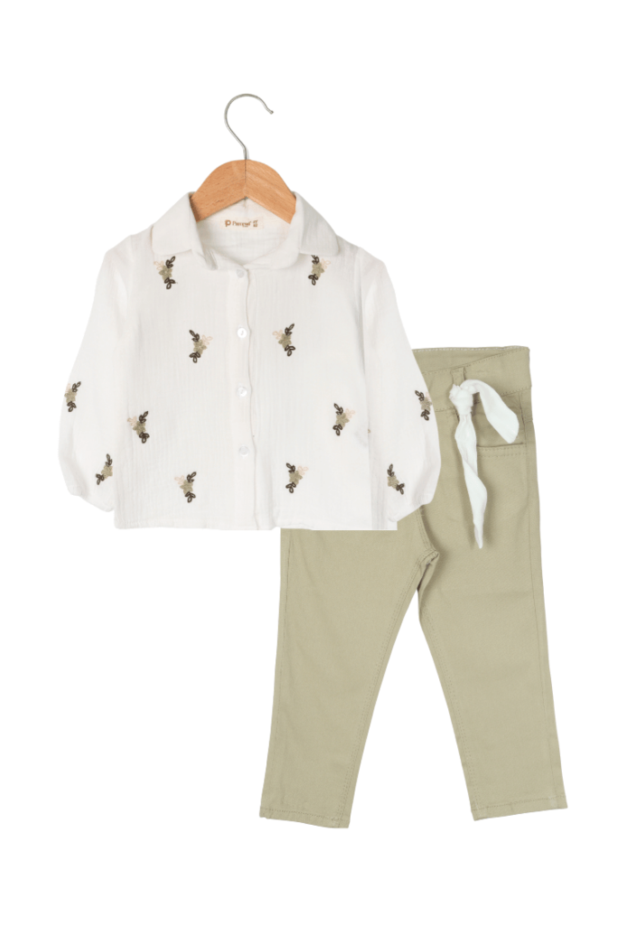 Kız Çocuk Bebe Yaka Çiçek Nakışlı Gömlek ve Pantolon İkili Takımı Krem-Yeşil