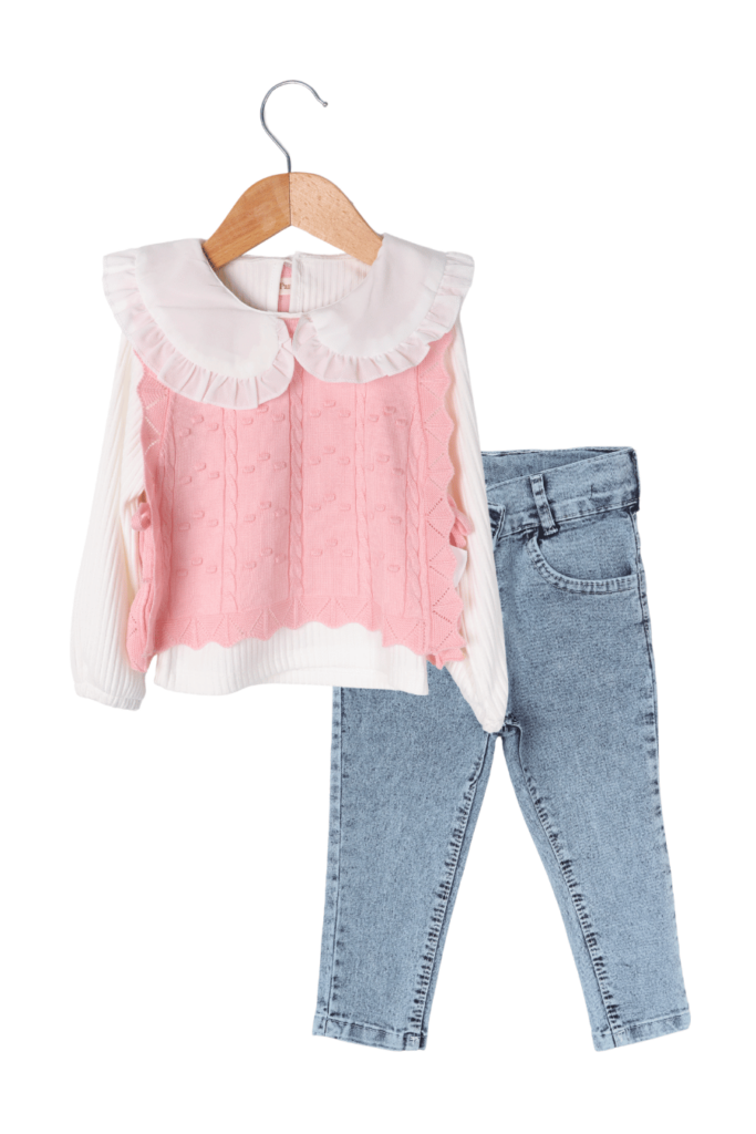 Kız Çocuk Fırfırlı Yaka Triko Yelekli ve Kot Pantolon 3’lü Takımı Pudra
