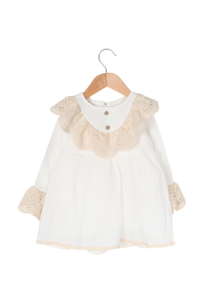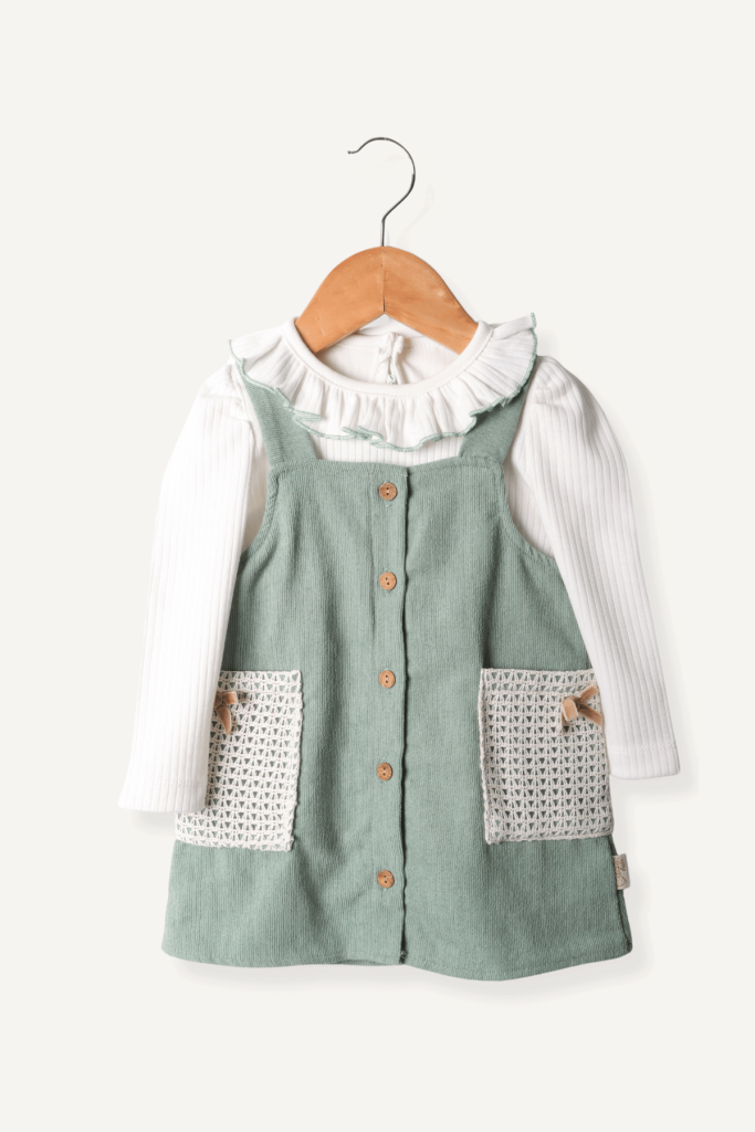 Bayramın en zarif ve şık kombinlerinden biri! Bu fırfırlı ve dantel detaylı uzun kollu elbise, klasik ve modern tarzı bir araya getirerek kız çocukları için harika bir seçenek sunuyor. Ahşap görünümlü düğmeler, fırfırlı yaka ve kollarla birleşerek şirin ve zarif bir görünüm oluşturuyor. Yumuşak ve esnek kumaşı sayesinde çocuğunuz bayram boyunca rahatça hareket edebilir.