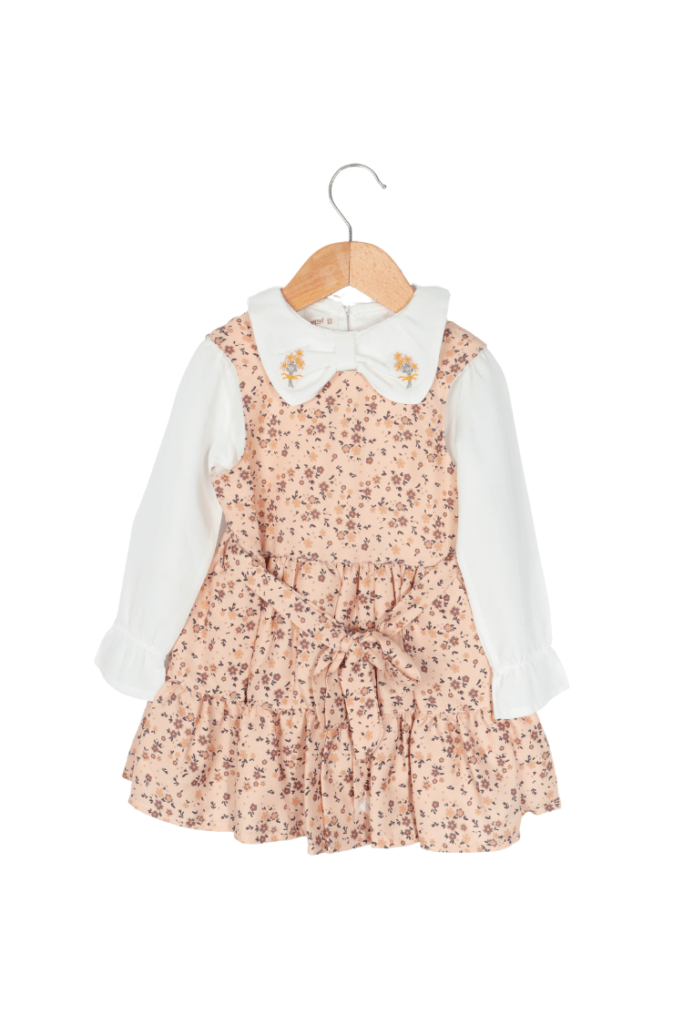 Bu elbise, babetler, sandaletler veya diz üstü çoraplarla kombinlenerek hem bayram hem de günlük kullanım için uygun bir seçenek sunar. Fırfırlı detayları, çocuğunuzun görünümüne zarif ve romantik bir hava katarken, rahat kesimi sayesinde hareket özgürlüğü sağlar.