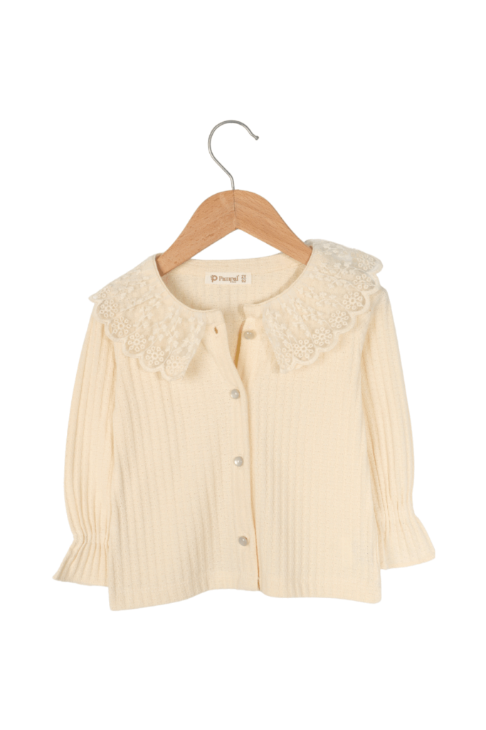 Kız Çocuk Fırfırlı Yaka ve Çiçek Desenli Uzun Kollu Hırka Krem
