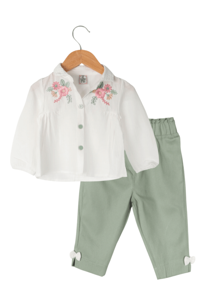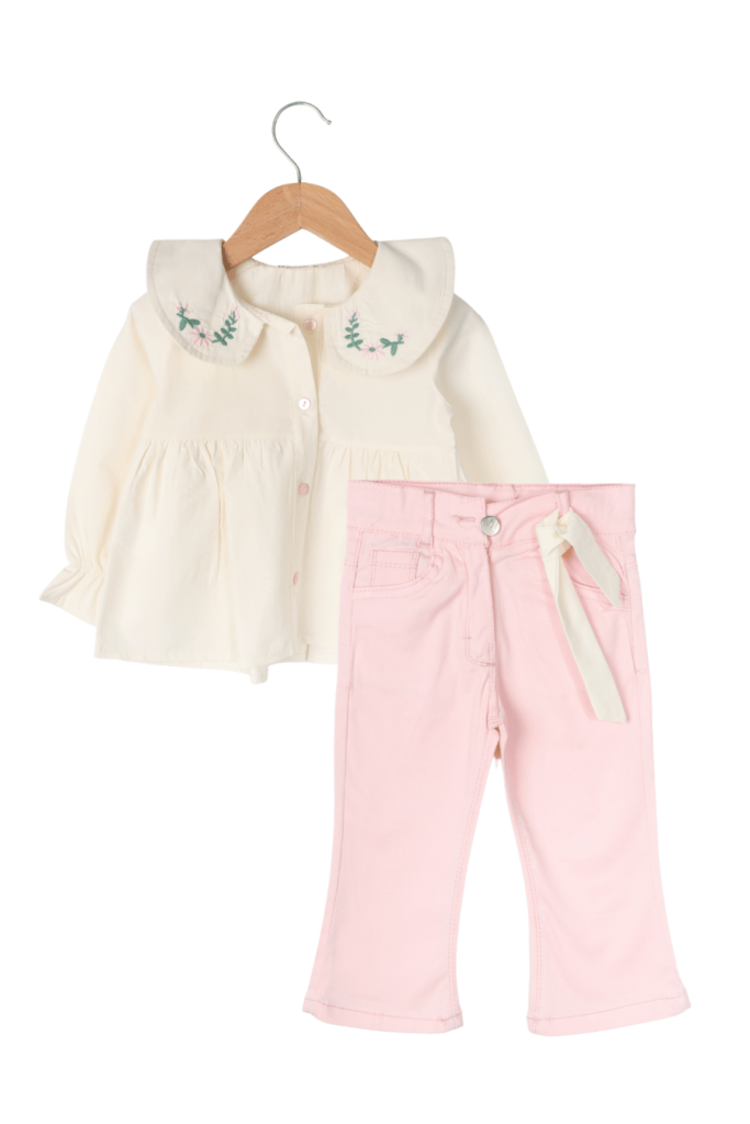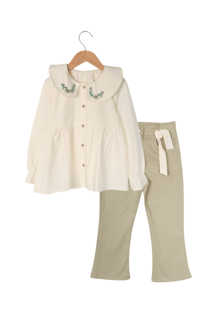 Orijinal fiyat: ₺899,90.₺649,90Şu andaki fiyat: ₺649,90.Kız Çocuk Bebe Yaka Çiçek Nakışlı Gömlek ve Pantolon İkili Takımı Krem-Yeşil