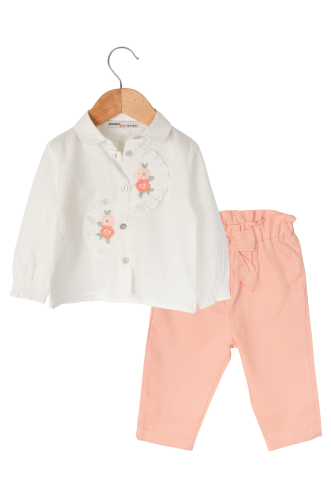 Orijinal fiyat: ₺599,90.₺419,90Şu andaki fiyat: ₺419,90.Kız Bebek Çiçek Nakışlı Gömlekli İkili Takım Krem