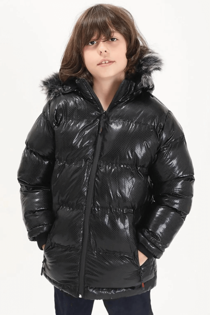 Kürklü Kapüşonlu Parlak Erkek Çocuk Mont Siyah